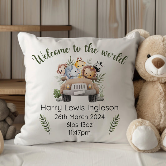 New Baby Personalised Safari Themed Cushion